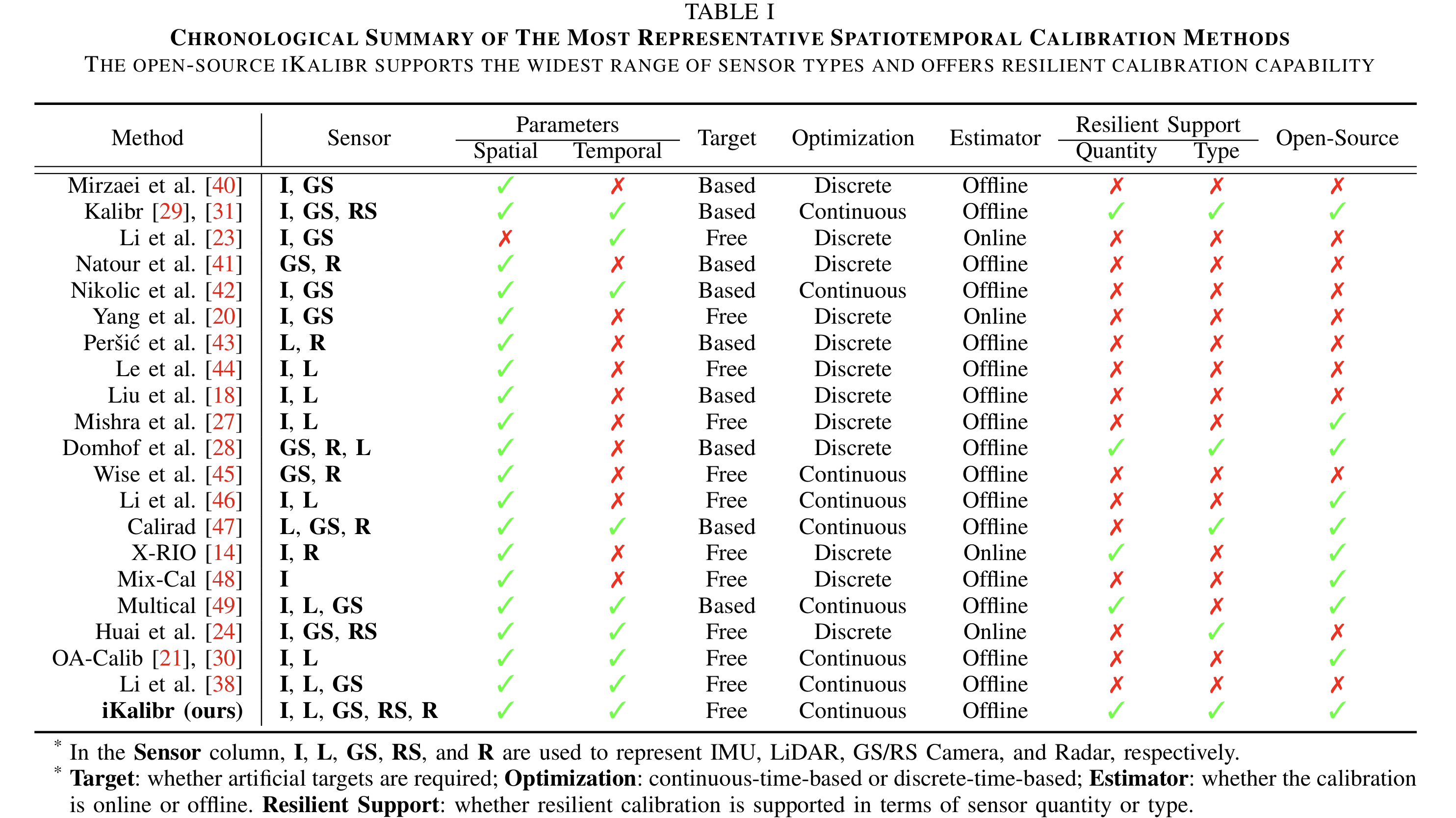 图1 多传感器时空标定领域多种方法的整理和对比