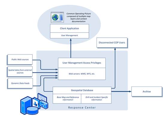 准确、及时、具有地理参考的信息对运营决策和战略决策至关重要。以前,紧急情况出现时专有数据库和软件不相容一直是一个问题。基于经验教训,政府机构要求民营部门支持开放标准,以在应急响应特殊情况时创立“通用运营图”。通过与政府和企业的合作,OGC引导着通用运营图(COP)应急架构的发展。图4给出了COP推荐的基于网络服务的服务架构。此架构已经在多个市区紧急情况中应用。图5给出了基于实践范例和开放标准的服务与接口。这种架构是基于操作系统和开发系统的。