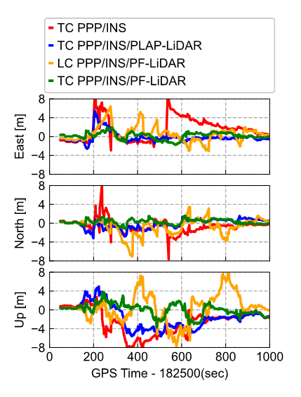 利用不同卫星观测条件下的车载实验表明,引入LiDAR平面特征的原始观测可以明显提高GNSS/INS紧组合方法的定位精度,即使在卫星信号严重遮挡的环境中也能够实现亚米级定位。此外通过实验发现,相比于传统点到面/点到线帧间匹配方法,本研究所提出的改进平面特征跟踪方法可以实现更稳定的数据关联,同时具有更高的计算效率。