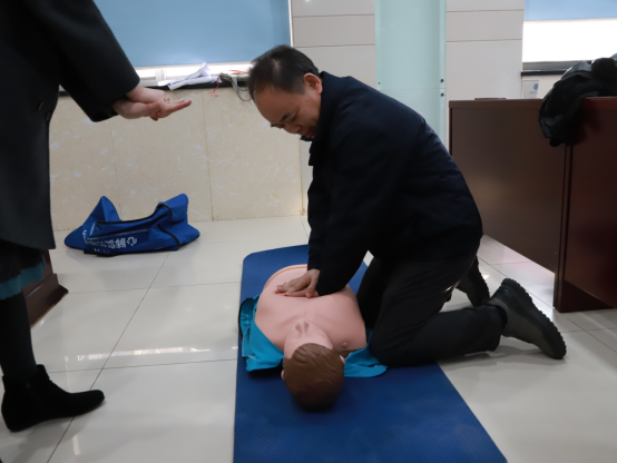随后,活动进入至关重要的急救技能环节。李主任及医护团队将专业知识转化为直观演示,详细讲解了心肺复苏术(CPR)的重要性、适用场景及标准操作流程。讲解清晰透彻,步骤明确。理论讲解后,多位教职工在专家团队的“手把手”指导下,踊跃上台进行了CPR和AED的模拟实操练习。医护人员耐心指导动作细节,确保大家掌握要领。现场互动积极,学习氛围浓厚,大家纷纷表示,掌握这些“黄金四分钟”内的急救技能,不仅是对家人同事负责,更是对社会的一份宝贵贡献。