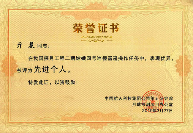 51论坛 14级博士研究生亓晨和杨欢参加嫦娥四号任务支持工作,圆满完成任务,被中国航天科技集团公司第五研究院月球探测工程项目办公室评为嫦娥四号任务支持“先进个人”。