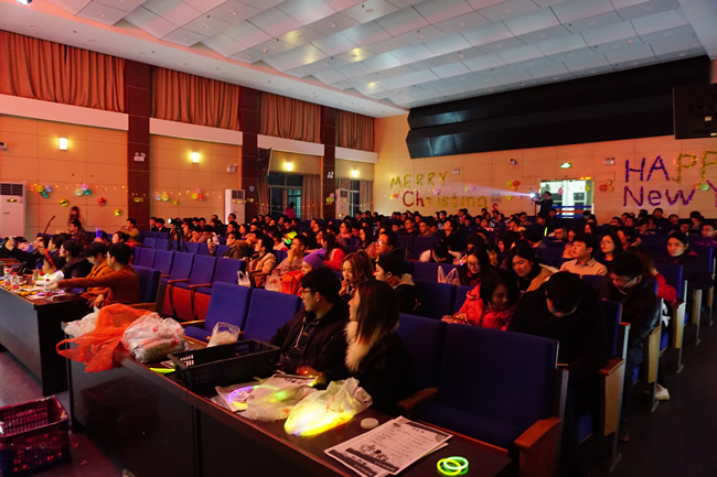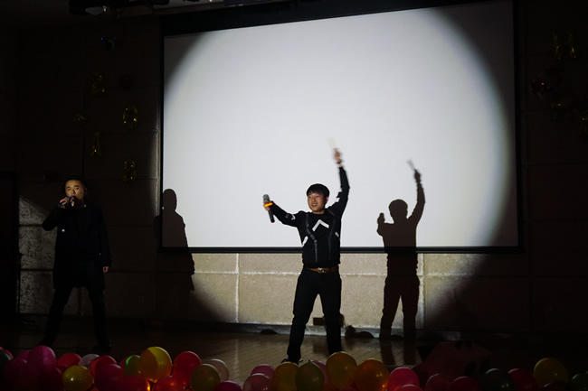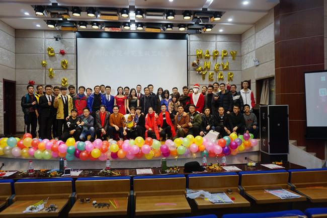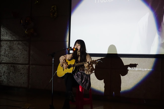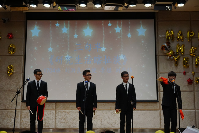 开场舞《我的青春叫周杰伦》为双旦晚会拉开了帷幕。歌曲、乐器类节目交替进行,精彩纷呈:1702班全体同学合唱了一曲饱含家国情怀和爱国热忱的《国家》,1702班谭涵带来了一首古朴淡雅又跌宕起伏的中阮独奏《丝路驼铃》,16级博士金荣河、1605班胡琪和1706班叶柳君分别带来了三首唯美动人、抒情悦耳的吉他弹唱《追光者》、《Secret Base》和《南方姑娘》。1706班吴伟、戴心野带来的粤语歌曲《红日》和1701班李佳妮带来的英文歌曲《Impossible》气氛热烈,将整场晚会推向高潮。1701班张弛、1705班许睿分别带来歌曲《谢谢侬》、《化身孤岛的鲸》,前者曲风轻快,后者宛转悠扬。晚会语言类节目诙谐幽默、笑点满满:由1706班带来的小品《监考老师》和1704班带来的三句半《研究生活瞎扯淡》都从研究生学习、生活出发,生动活泼地演绎出了研究生生活中的酸甜苦辣;本科生代表带来的小品《后宫那些事》,声情并茂地展现了妃子的爆笑争宠之举,而最后“皇上”带领“妃子”们尬扭秧歌,引爆了整部剧的笑点。由SUP舞室的小Y、豆豆带来的舞蹈《Sorry Not Sorry》,惊艳全场,引得观众尖叫不断。褚丽丽老师和研会主席团成员带来了歌曲联唱《我们的歌》。
