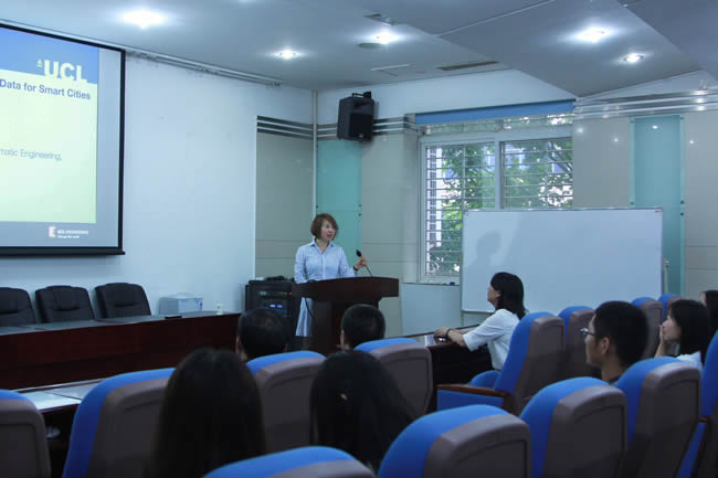 程涛教授首先介绍了伦敦大学学院(UCL),然后从交通出行、智能出警、商业智能、环境应急和个人健康等方面对智慧城市作了深入的分析和阐述,报告结合伦敦地区道路交通情况、商圈人流量动态变化等时空大数据信息,指出智慧城市中与人类活动密切相关的内容。程涛教授的学术报告内容生动、数据详实,使与会师生对大数据和智慧城市有了更深刻的理解与认识,感受到大数据与我们的日常生活息息相关、密不可分。报告结束后,与会人员就感兴趣的问题与程涛教授进行了交流讨论。