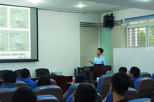 许文斌助理教授作了题为“Satellite radar and optical remote sensing studies for volcanoes in the divergent plate boundary”的学术报告。许文斌博士通过InSAR和光学遥感数据,重点介绍了红海及其周边火山喷发机理的相关研究,得到火山喷发过程中火山岩的流动路径、覆盖范围、覆盖厚度和喷发量等信息。