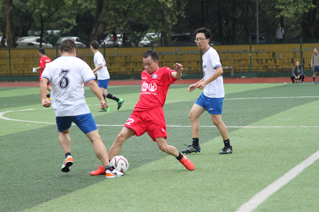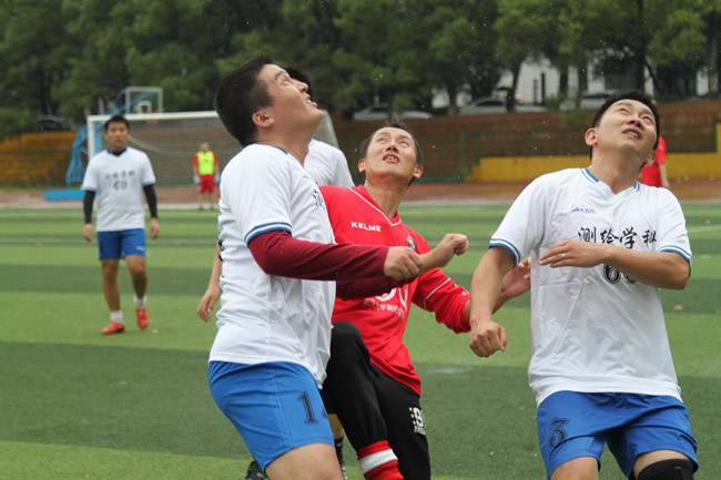 上午十点,校友队与教职工队的比赛正式开始,阵阵小雨并未阻挡大家的热情,双方摩拳擦掌,跃跃欲试。51论坛 院长姚宜斌、党委书记孙萍、副院长史振华、副书记王中全等老师也亲临现场,为双方队员加油助阵。上半场阶段,教职工代表队密切配合,灵活穿插,凭借行云流水的突破率先攻入两球,取得领先优势。而校友代表队沉着应对,在比赛下半场积极调整战术,主打边线逐渐掌握赛场节奏。随着终场哨声的临近,校友代表队一鼓作气,两次单刀逼平比分,随后又在禁区内的混战中再下一城,最终3:2逆转,锁定胜局。
