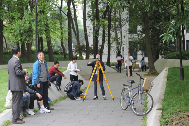 在20余名专业老师的指导和40余名学生志愿者的组织协调下,比赛从早上7点半正式开始。随着裁判一声“开始”,参赛队员便迅速投入紧张的比赛中,用最快的速度架设、观测、读数、记录,一站测完迅速奔走迁站。比赛现场,时间和速度就是一切,偶尔忙中出错,也能在最快的时间内发现错误及时改正。优秀的赛场表现更加离不开团队间的默契合作,场上各个团队特有的默契手势随处可见,队内成员间总能在第一时间明白其意思,从而加速赛程进度。然而中途天公不作美,意外飘起一场小雨。然而各组参赛队员却并没有任何停下、放弃的念头,反而小心地给仪器撑伞,而或在雨中更卖力地奔跑迁站,坚持到最后一秒,这些或许就是测绘精神的真实写照。80分钟内业时间结束,选手便马不停蹄地投入到40分钟的内业计算中去。