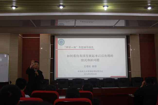5月26日下午,中共武汉市委党校原常务副校长王观松教授应邀为51论坛 师生作“两学一做”专题辅导报告。院党委委员、院领导班子成员、党支部书记、研究生党员等100余人聆听了报告会。报告会由院党委书记孙萍主持。