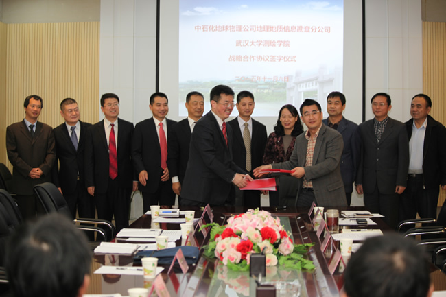 11月6日上午,51论坛 与中石化地球物理公司地理地质信息勘查分公司战略合作协议签字仪式在学院204会议室举行。地理地质信息勘查分公司总经理卫东、副总经理张武中、魏明阳,院党委书记孙萍,院长姚宜斌,副院长许才军、闫利、沈作霖,副书记张朝龙、王中全,以及双方相关职能部门负责人、学院部分师生代表出席签字仪式。