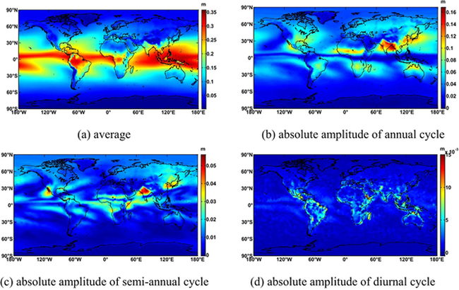 对流层修正模型在全球导航卫星系统(GNSS)中扮演着至关重要的作用,正在受到越来越多的关注。迄今为止最常用的模型包括GPT2系列和TropGrid2。在这项研究中,他们分析了现有模型的优缺点,并提出和开发了一种改进的对流层格网新模型(ITG)。该模型顾及了年、半年和昼夜周期变化,其中日变化的振幅和初相被定义为周期函数。ITG模型提供包括温度、压强、加权平均温度(Tm)和天顶湿延迟(ZWD)在内的多个对流层参数。通过698个气象观测站数据、280个IGS跟踪站的天顶总延迟(ZTD)产品和全球大地测量观测系统(GGOS)提供的Tm产品对ITG模型和以往的模型进行了性能比较,结果表明,ITG能提供偏差为0.04cm、RMS为3.73cm的全球对流层延迟修正,其整体表现最佳。