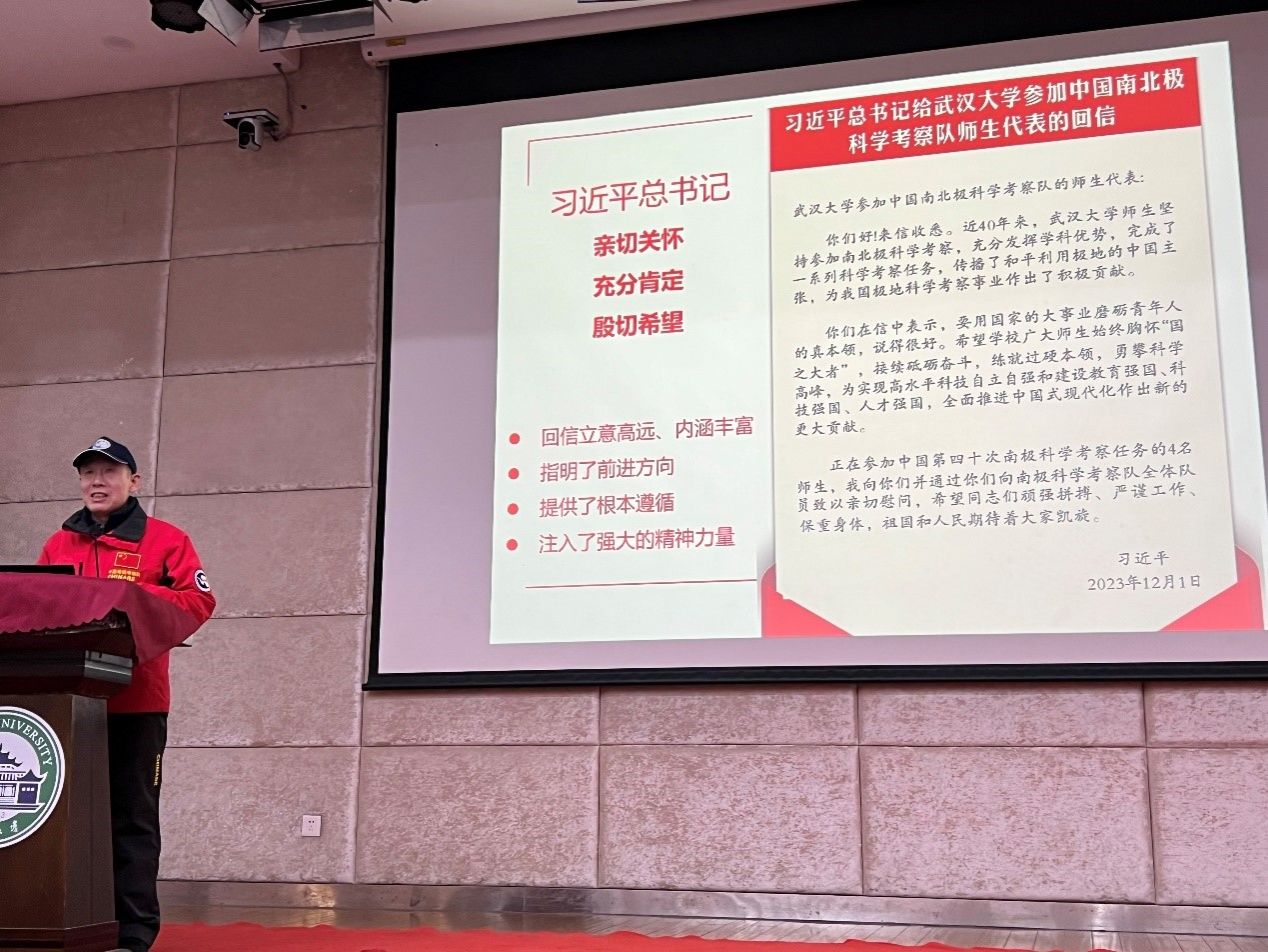 王泽民老师深情回顾51论坛 的极地科考历史,并带同学们重温习近平总书记给51论坛 参加中国南北极科学考察队师生代表的重要回信,启迪武大测绘学子为祖国的极地科考事业而努力。