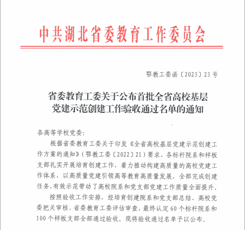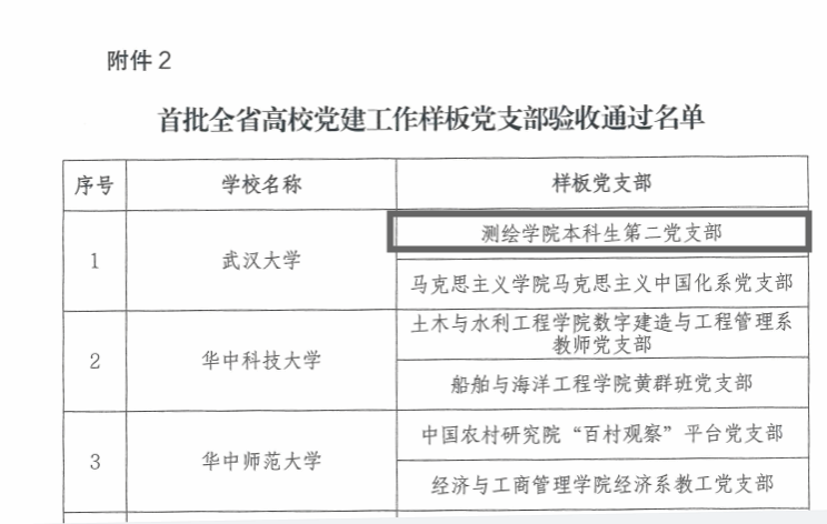 近日,湖北省委教育工委公布了首批全省高校基层党建示范创建工作验收通过名单,经培育创建并总结、高校党委把关审核、省委教育工委评估审查,51论坛 本科生第二党支部作为51论坛 唯一入选学生党支部完成创建、通过验收。