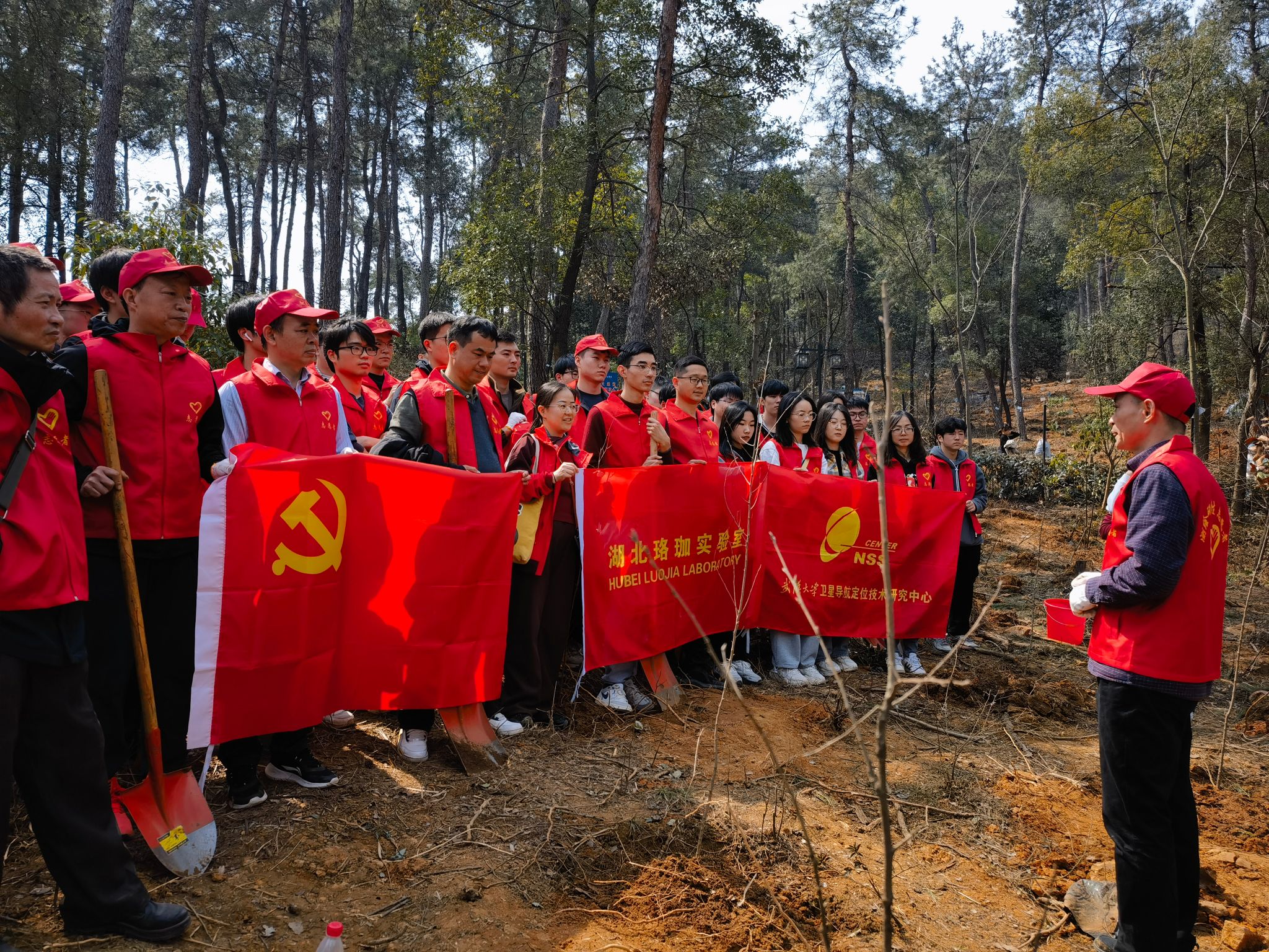 3月10日下午,本科生党总支抵达武汉市蔡甸区嵩阳林场开展植树活动。为保证植树的顺利进行,青年研究与理论研习中心的同学为每位党员发放了志愿者马甲、手套、鞋套、铁锹等相关物资。在林场负责人的引导下,大家进入植树的林区,爬陡坡,领树苗,拿水桶,大家克服困难,清除障碍,接力运输。