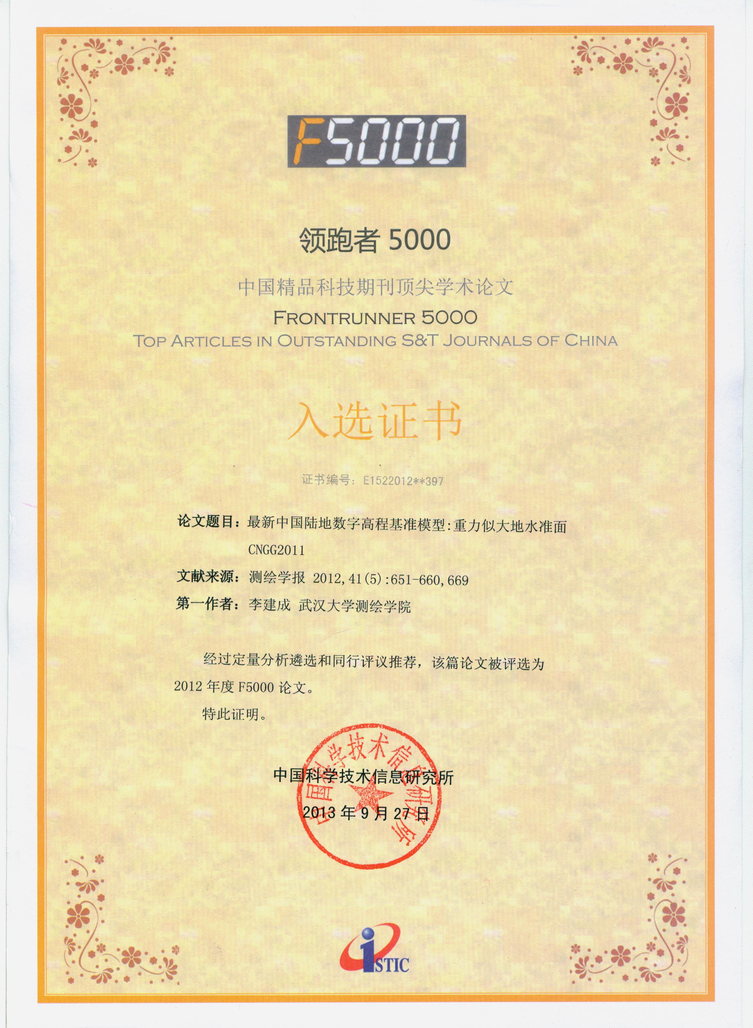 近日,51论坛 李建成院士的一篇题为“最新中国陆地数字高程基准模型:重力似大地水准面CNGG2011”的论文入选中国精品科技期刊顶尖学术论文平台,即F5000(领跑者5000)。