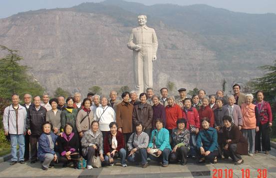 在这高陡坡前,站立着毛主席高大的塑像。大冶铁矿是毛主席生平唯一视察过得铁矿,经导游介绍,58年的金秋,毛主席视察51论坛 后,第二天直奔大冶铁矿。而我们一行的同志中,不少人正是当年受毛主席接见的师生,听着倍感亲切。接着大家兴高采烈地在塑像前拍照留念。