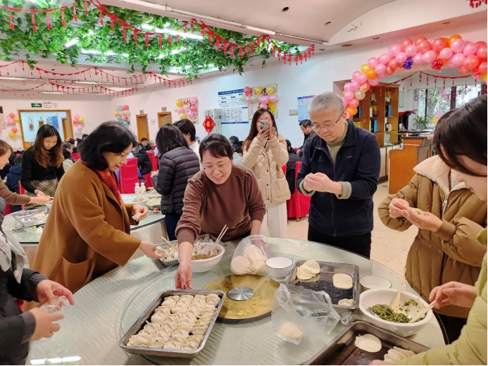 学院工会精心布置的场地充满了节日的气氛,准备好的饺子皮、丰富多样的饺子馅以及包饺子所需的工具一应俱全,大家围坐一起,边聊天边动手,欢声笑语不断。在包饺子的过程中,老师们一改平日站在讲台上的端庄形象,纷纷化身美食达人,满怀热忱地投入到包饺子活动中。一连串动作如行云流水,一个个饱满可爱的饺子便在指尖 “诞生”。