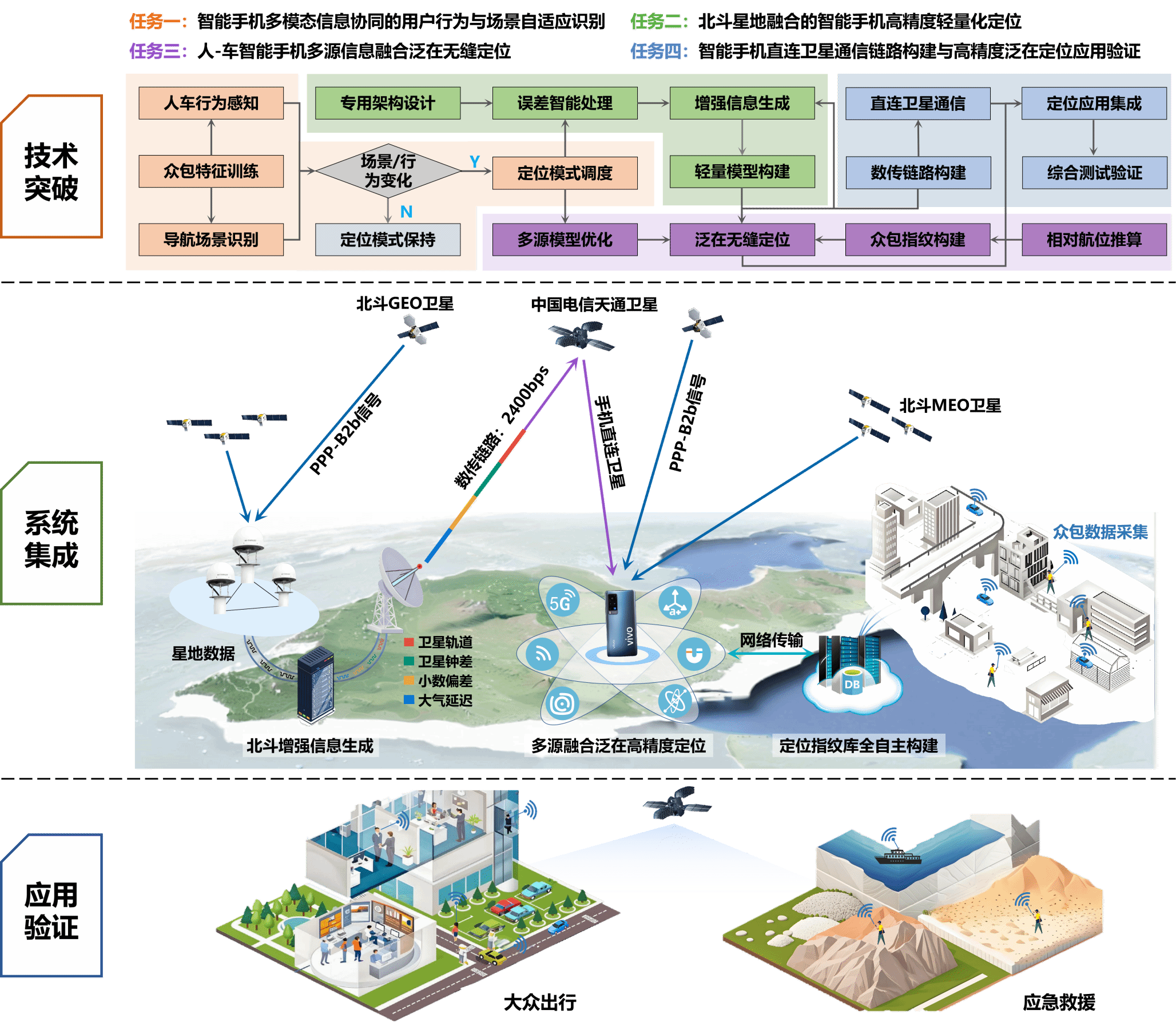 在国家时空信息与综合PNT体系建设的重大战略需求指引下,面向星地网络融合、通信导航一体化发展趋势,项目开展智能手机直连卫星高精度泛在定位新方法研究,突破智能手机直连卫星通信、用户行为与场景自适应识别、星地融合与北斗优先的高精度轻量化定位、多源信息融合泛在定位等关键技术,研发可弹性融合北斗-磁-电-惯-运动约束-众包指纹库等信息的高精度泛在定位软件包,并在大众出行和应急救援中开展典型场景应用验证,推动北斗系统在大众消费领域的创新发展,显著提升我国PNT科技水平,促进卫星互联网与高精度位置服务产业融合创新。