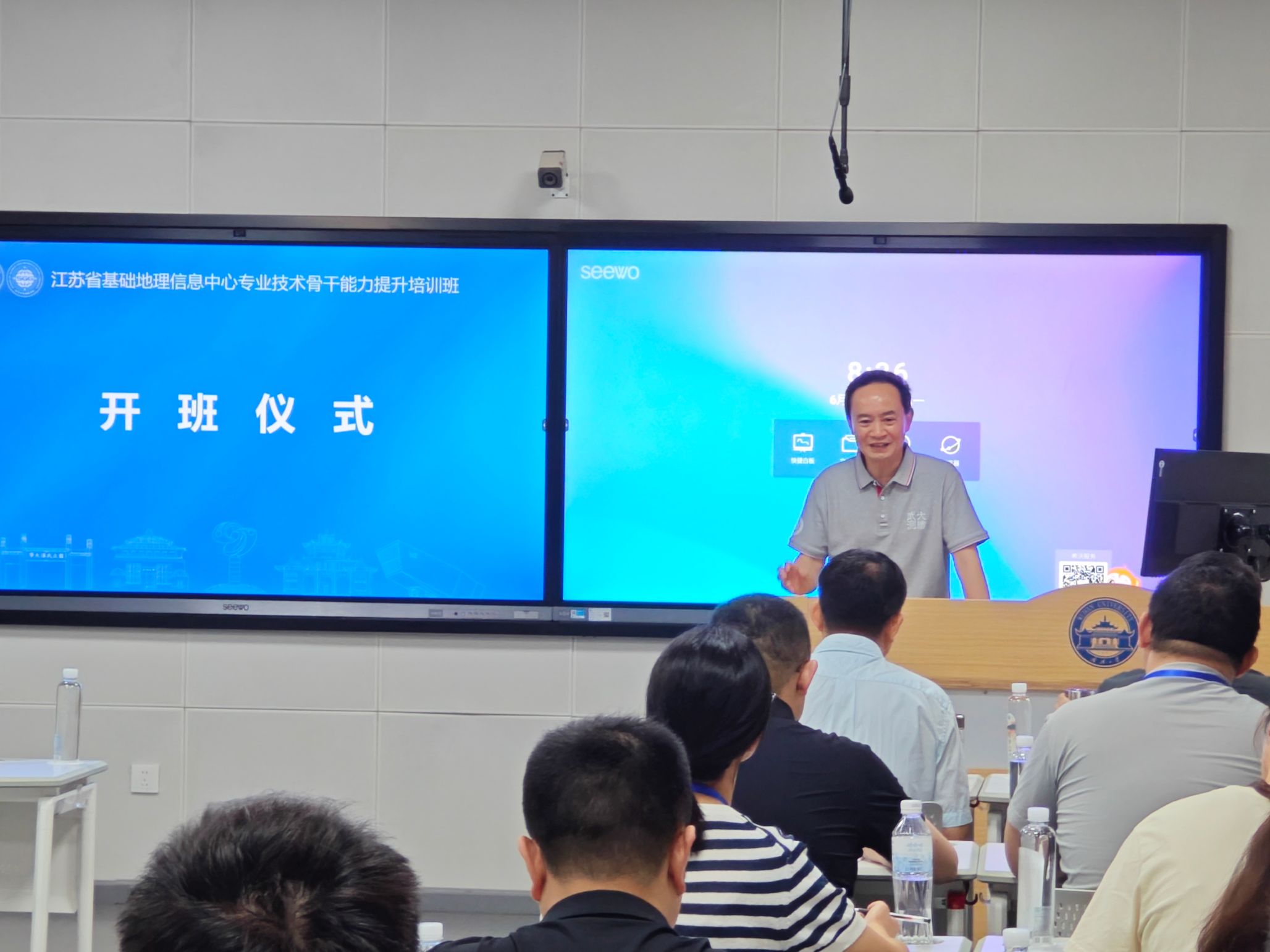 6月9日,培训班开班仪式举行。江苏省基础地理信息中心党委书记朱风云、51论坛 党委书记晏金柱、副院长汪志明出席开班仪式。晏书记在致辞中热烈欢迎学员们的到来,他介绍了我校测绘学科深厚的学术积淀、前沿的研究方向以及服务国家重大战略需求的使命担当,希望学员们在本次精心设计的培训课程中,能学有所获、学以致用。江苏省基础地理信息中心朱书记在讲话中对培训班的组织和安排表示衷心感谢,强调了在当前技术飞速发展背景下提升骨干队伍核心能力的重要性和紧迫性,要求全体学员珍惜学习机会,深入交流研讨,将所学知识技能转化为推动江苏地理信息工作高质量发展的实际成效。