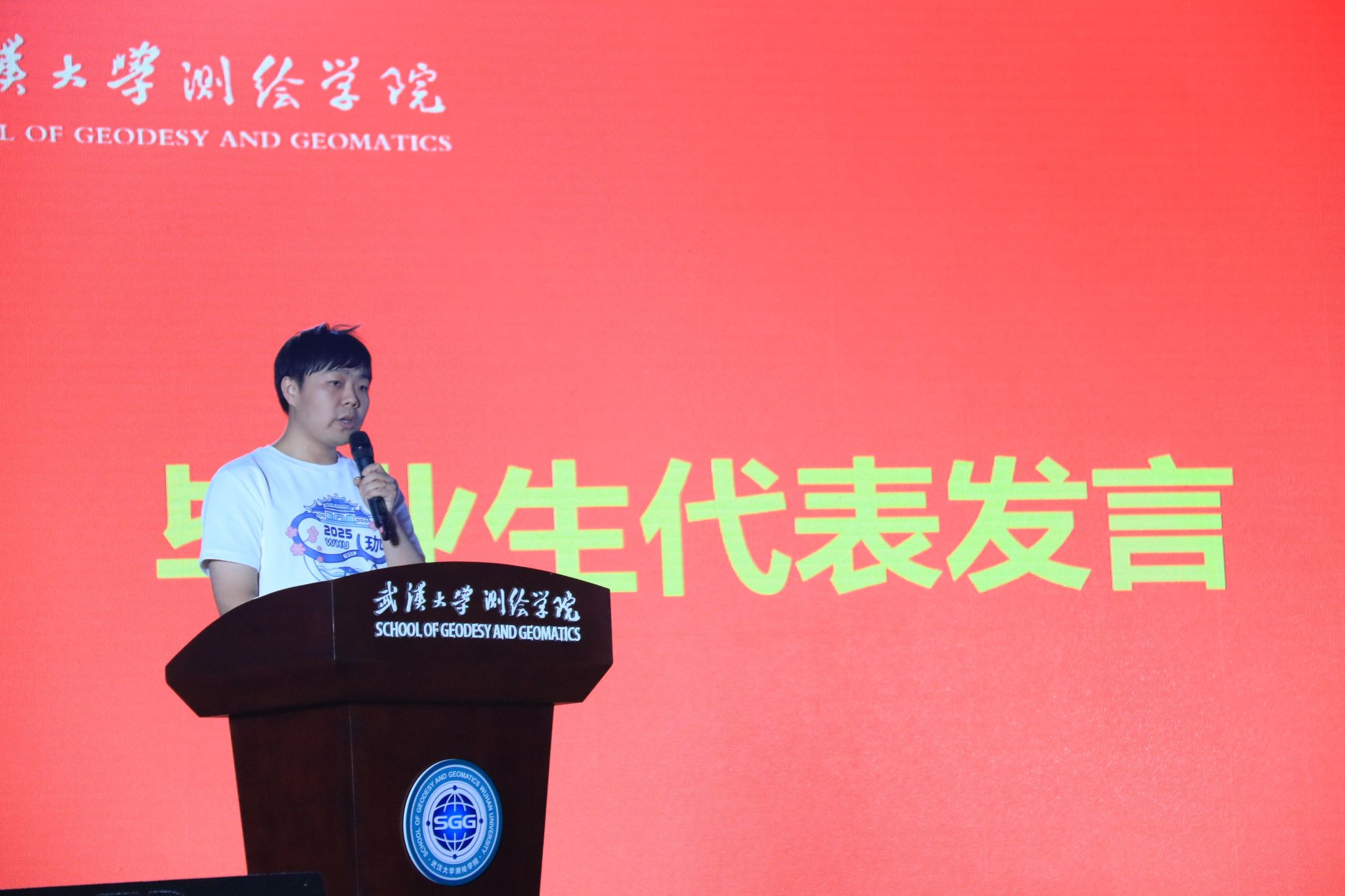 优秀毕业生代表发言。本科优秀毕业生代表黄俊同学结合自身成长经历,讲述了自己在学校和学院的培养和引导下,逐步从未知走向热爱,度过了最灿烂的四年大学时光。优秀毕业研究生代表李圣雨以十年珞珈岁月为轴,分享从测绘工程到北斗导航的学术征程,道出“测绘精神让精密坐标有了人文温度”的深切感悟。