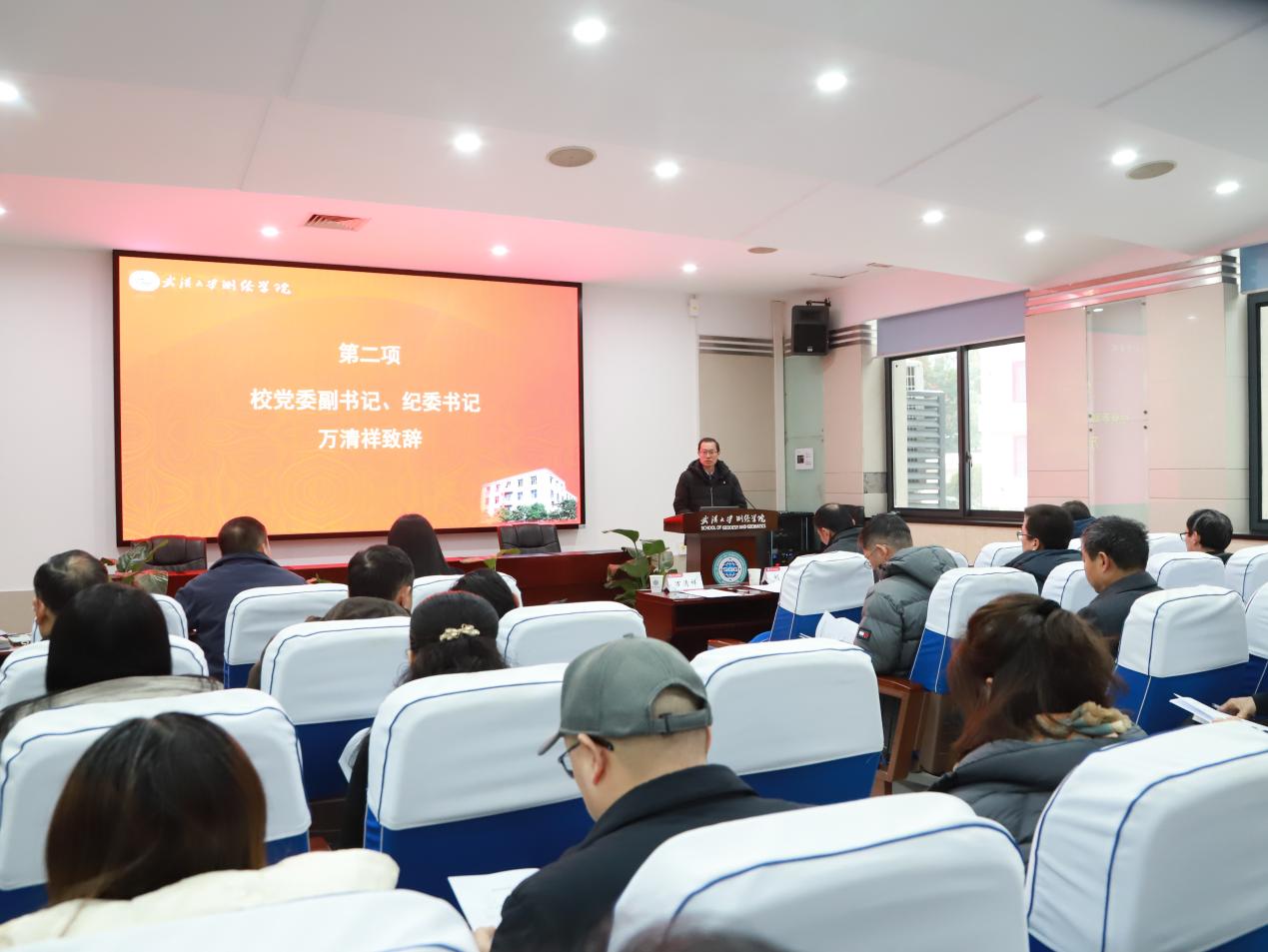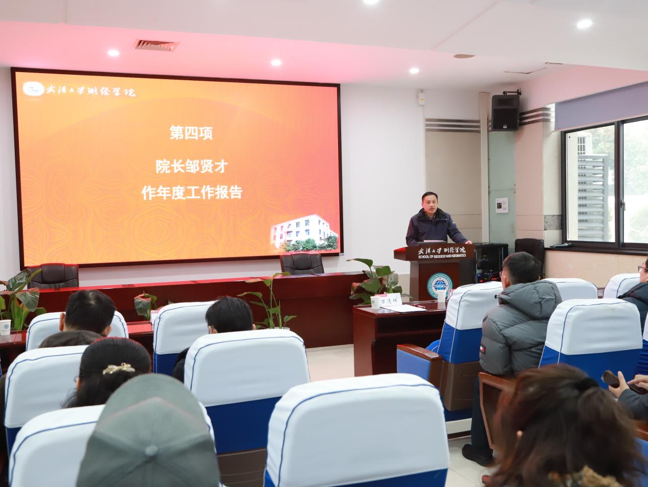 院长邹贤才代表学院领导班子作《2025年度学院工作报告》。报告回顾了2025年学院在理论武装、学科建设、人才培养、科学研究及师资队伍建设等方面取得的阶段性进展与显著成效。