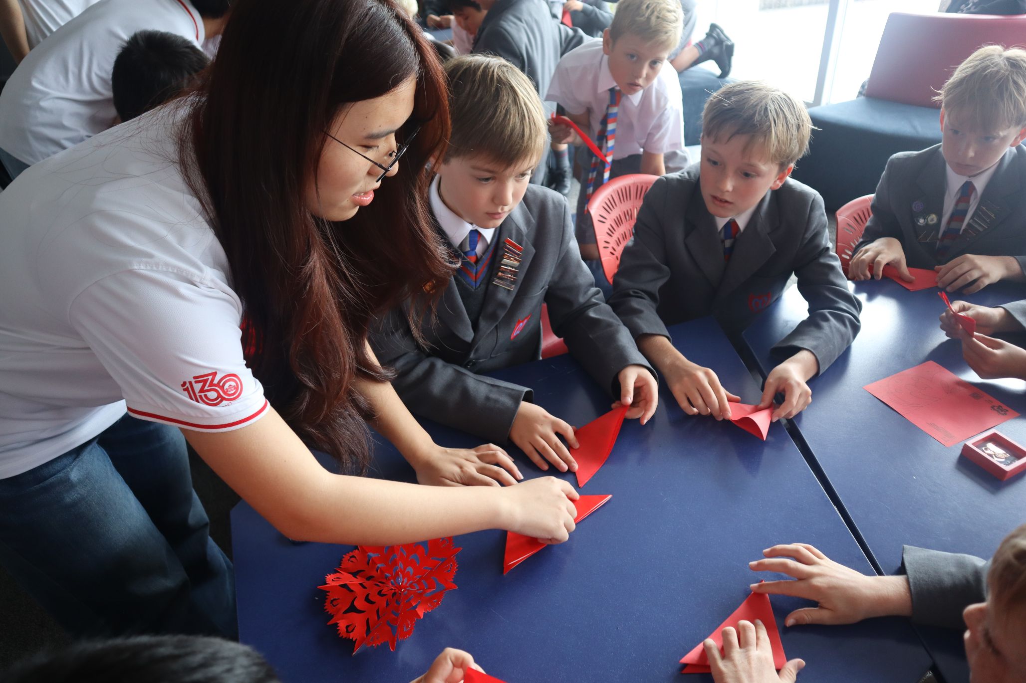 随后,队员们从汉字书法、汉语拼读、春节习俗、剪纸手工四大特色主题出发,带领当地学生提笔书写汉字、学说日常汉语、感受年俗魅力、巧手创作剪纸作品,让新西兰青少年在沉浸式互动中感受中华优秀传统文化的深厚底蕴,在轻松的双向交流中拉近中新青少年的心灵距离。