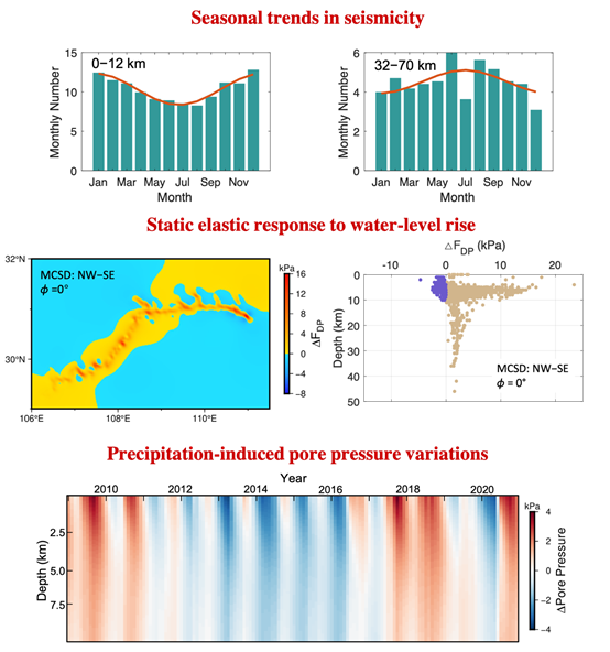 水圈变化可以促进或抑制区域地震活动,该过程受到多种因素的控制,包括初始应力状态、预先存在的断层、裂缝的水力传导率和岩石的水动力特性等。在三峡库区,由于人类的调节,水库水位和自然降水呈现出相反的季节模式。这使得该区域成为研究水圈变化与区域地震时空活动关系的理想场所。