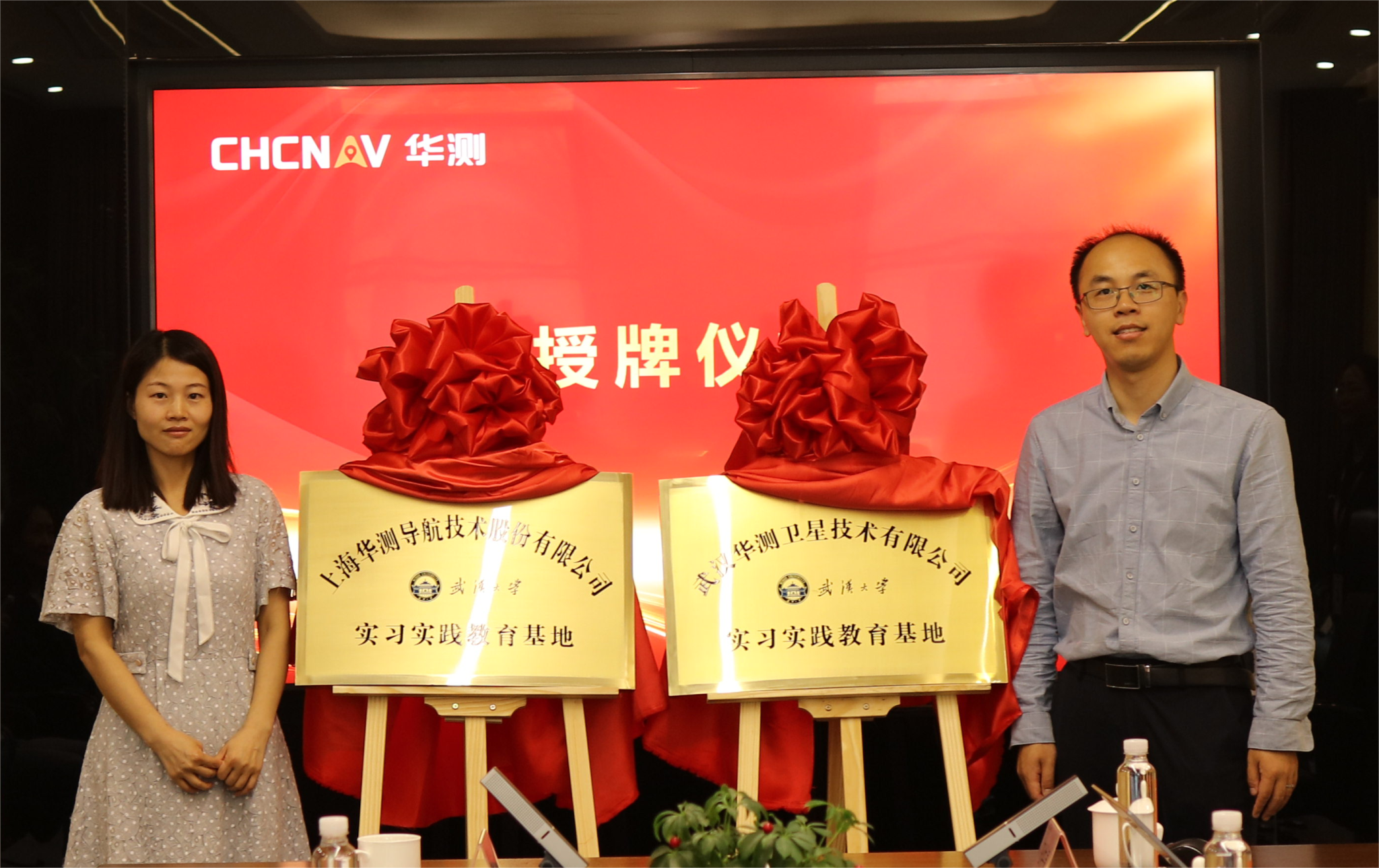 本科生院漆玲玲副处长与华测导航袁本银高级副总裁在各位代表的见证下,共同为上海华测和武汉华测实习基地揭牌。