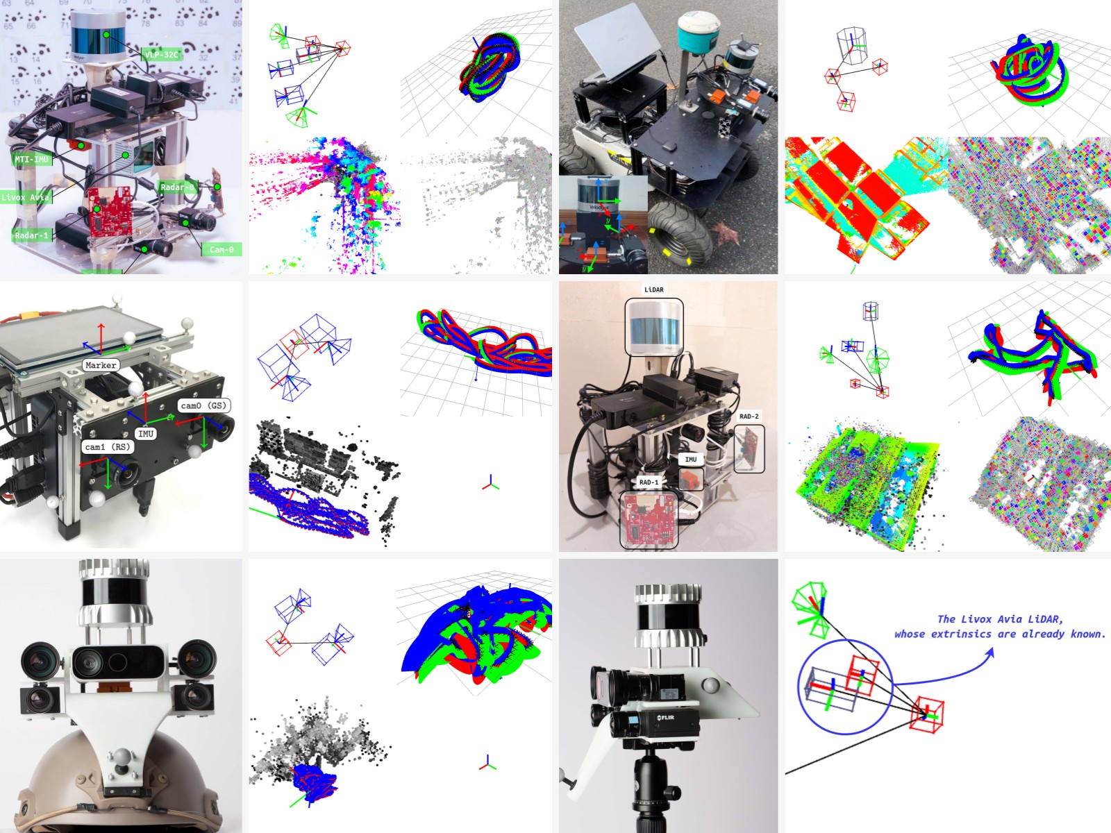 针对以上的问题,研究团队提出iKalibr:一个面向弹性集成惯性系统的无靶标时空标定框架,该框架克服了现有方法的局限性,并能实现精确、一致的多传感器时空标定。目前,iKalibr支持四种常用传感器的一次性联合标定,包括IMU、4D毫米波雷达(Radar)、激光雷达(LiDAR)及视觉传感器(Camera)。为验证该框架的可行性并评估其标定性能,研究团队开展了充分的实测实验(见图2)。实验结果表明,iKalibr能够实现高精度的时空参数标定。为促进相关领域研究,相关工作已在GitHub平台开源(链接见文末)。